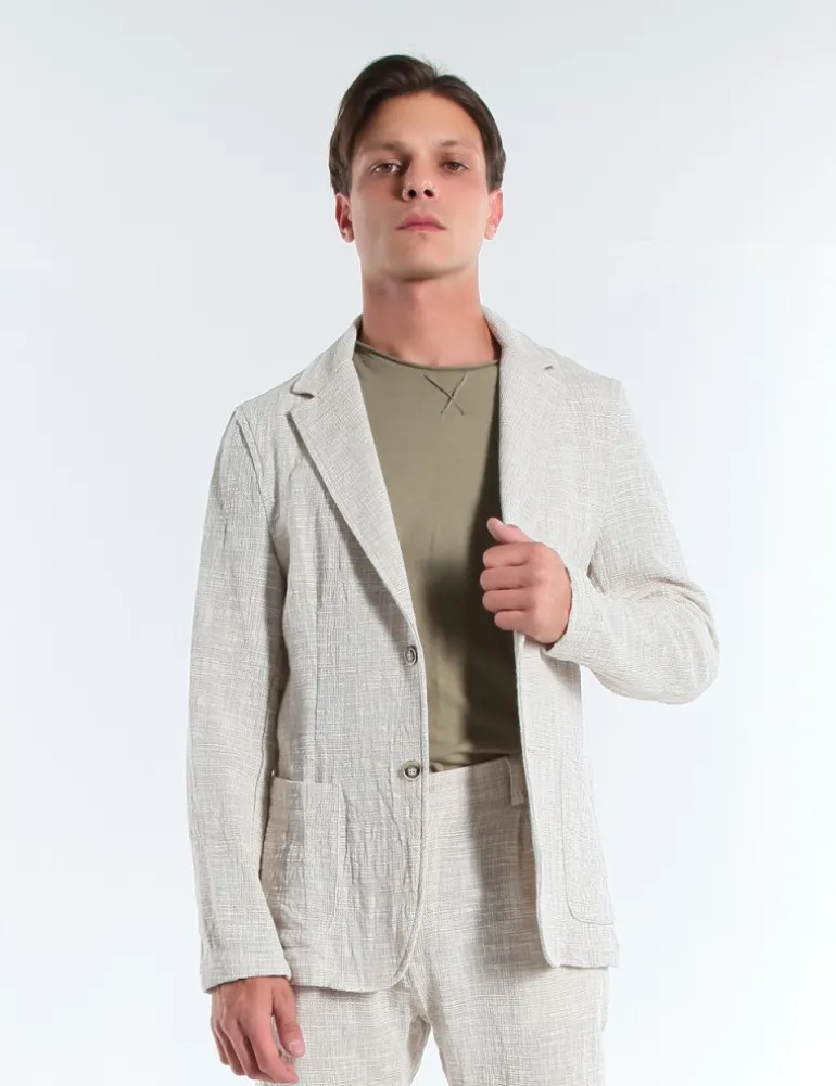 BLAZER HODER COLORE BEIGE, IN TESSUTO A TRAMA LARGA, COLLO CON REVERSE, TASCHE APPLICATE, CHIUSURA FRONTALE CON BOTTONE.
