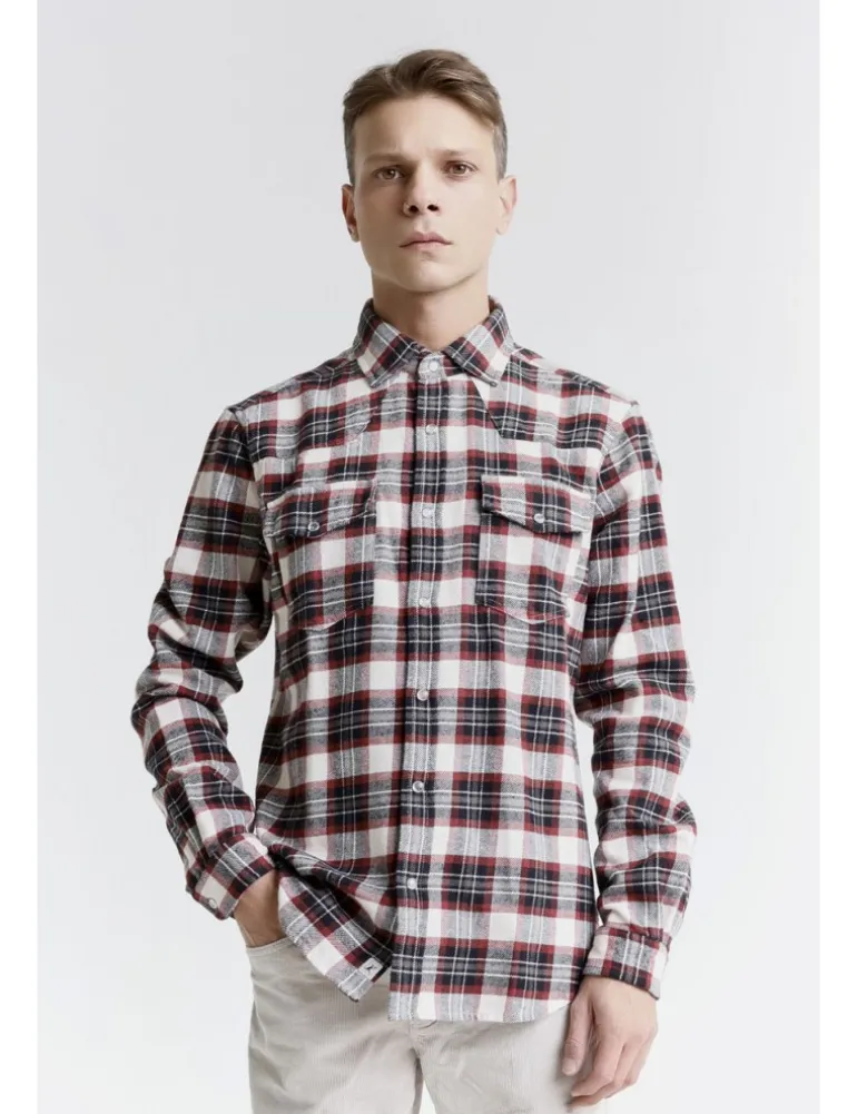 Camicia modello drobs in caldo tessuto di cotone, colore nero e wine. Colletto classico, dettaglio doppi taschini con chiusura a bottone sul petto e polsi classici.