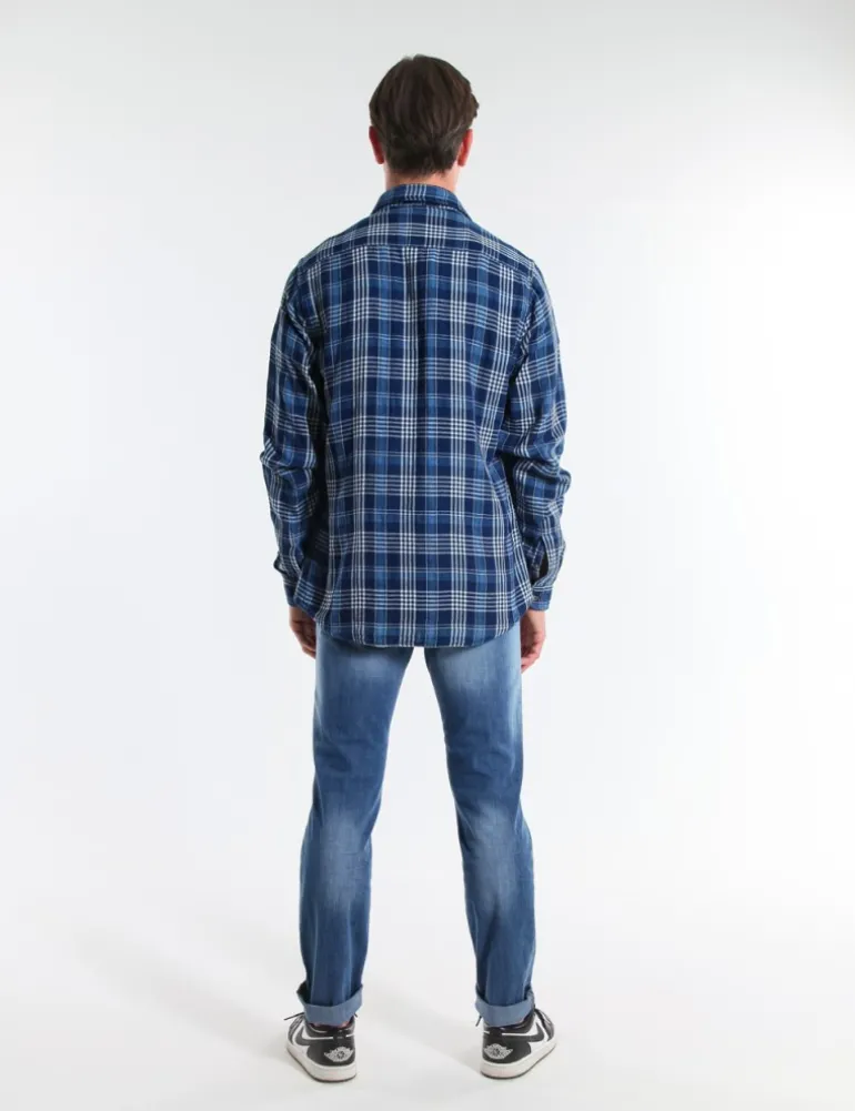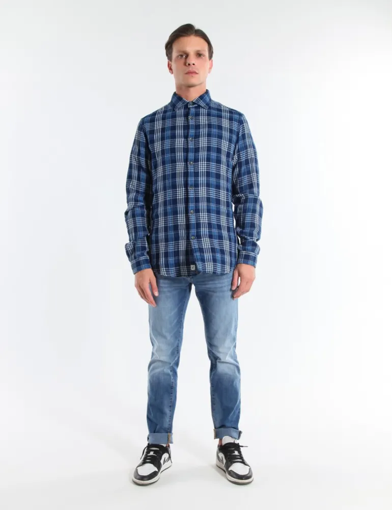 CAMICIA KRON INDACO IN COTONE A QUADRI CON VESTIBILITA’ REGOLARE, COLLETTO CLASSICO, BOTTONIERA CLASSICA E CARRE’ DIETRO, MANICHE LUNGHE CON FESSINO E BOTTONE, POLSINO CON BOTTONE.