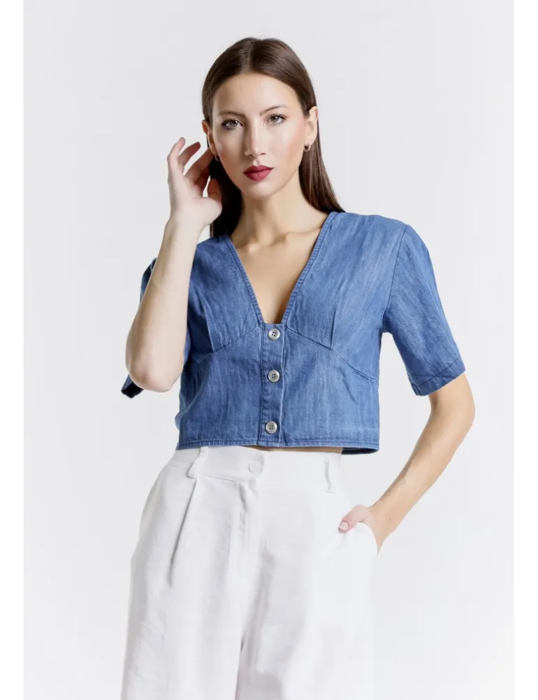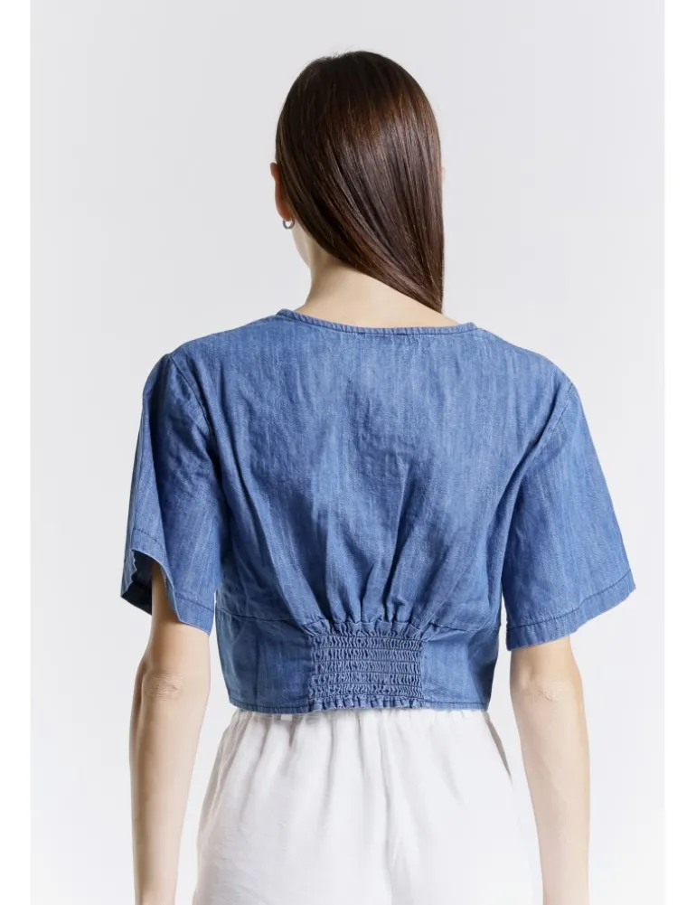 Camicia ilma in tessuto denim, lavaggio medium used. Dettaglio scollo ampio a V, manica larga, pinces frontali, chiusura con bottoni frontali e lavorazione con punto smock sul dietro.