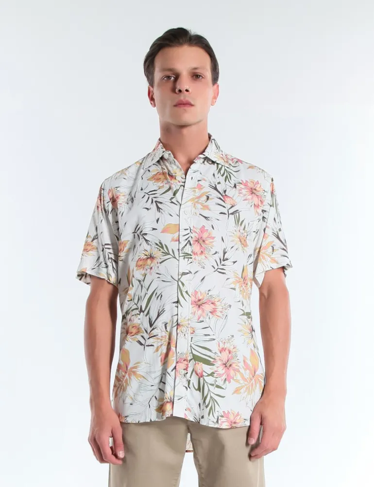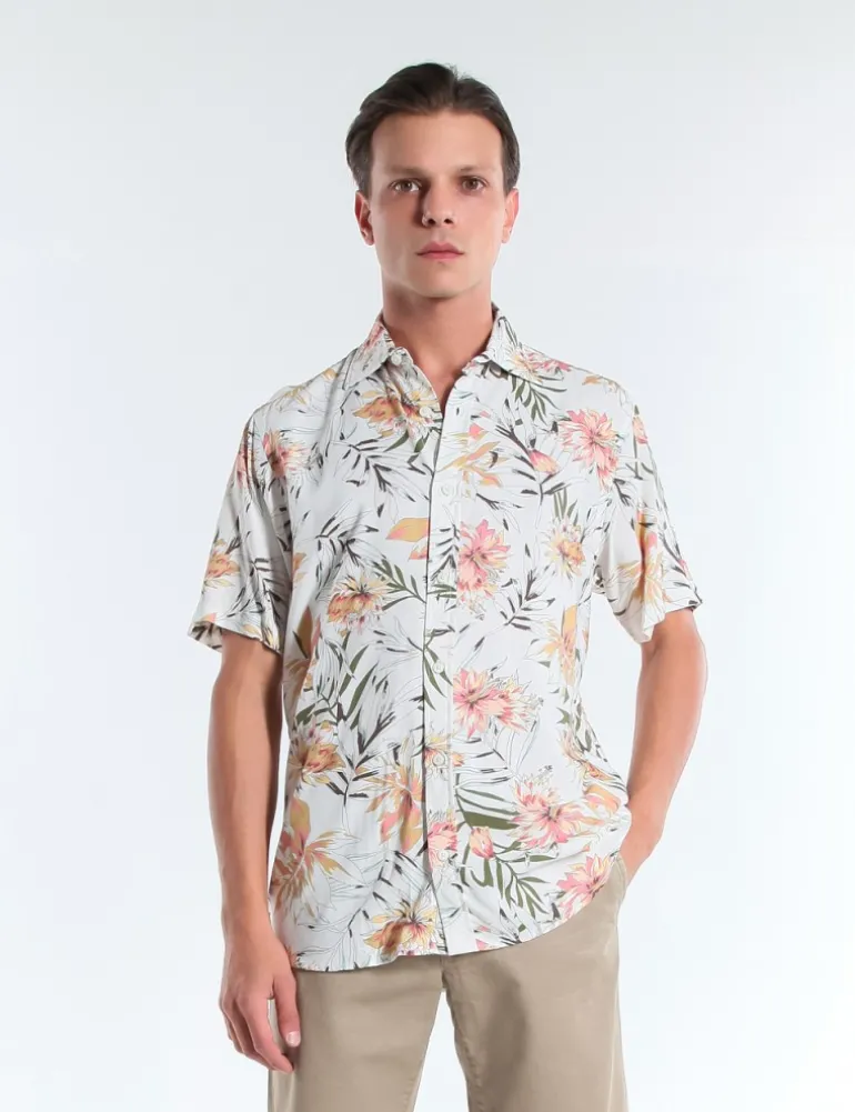 CAMICIA MARTIN BIANCO/TIMO CON STAMPA FLOREALE, IN VISCOSA CON VESTIBILITA’ REGOLARE, BOTTONIERA FRONTALE, COLLO BOWLING E CARRE’ DIETRO.