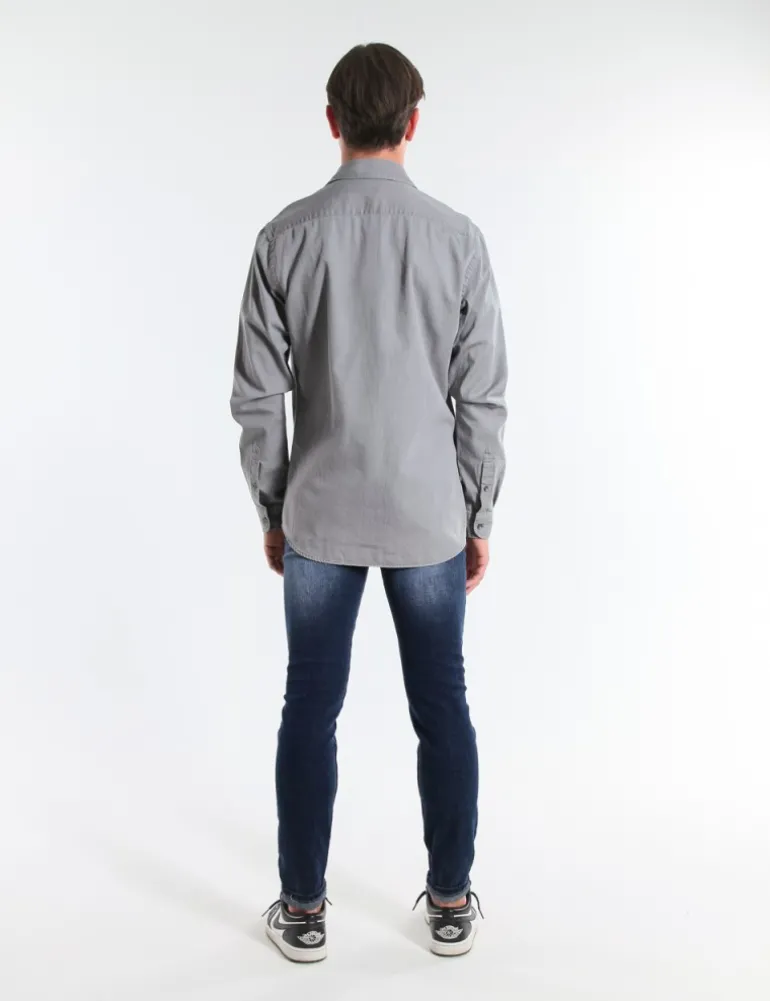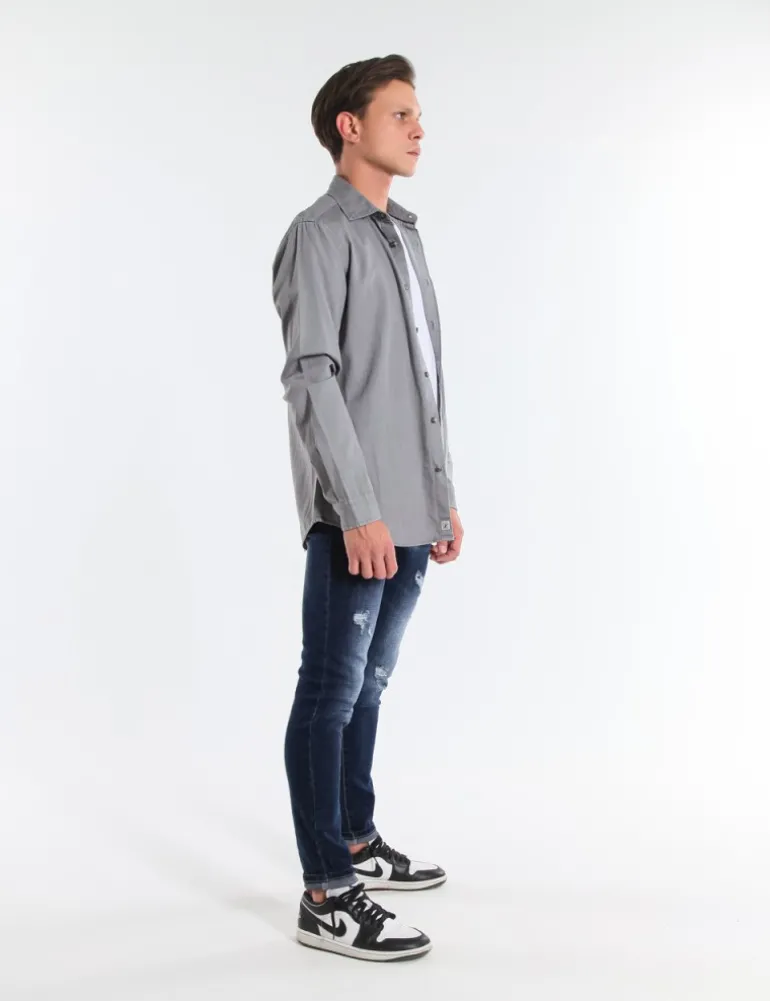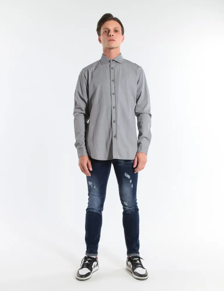 CAMICIA TEMPLE GRIGIO IN COTONE CON VESTIBILITA’ REGOLARE, COLLETTO CLASSICO, BOTTONIERA CLASSICA E CARRE’ DIETRO, MANICHE LUNGHE CON FESSINO E BOTTONE, POLSINO CON BOTTONE.