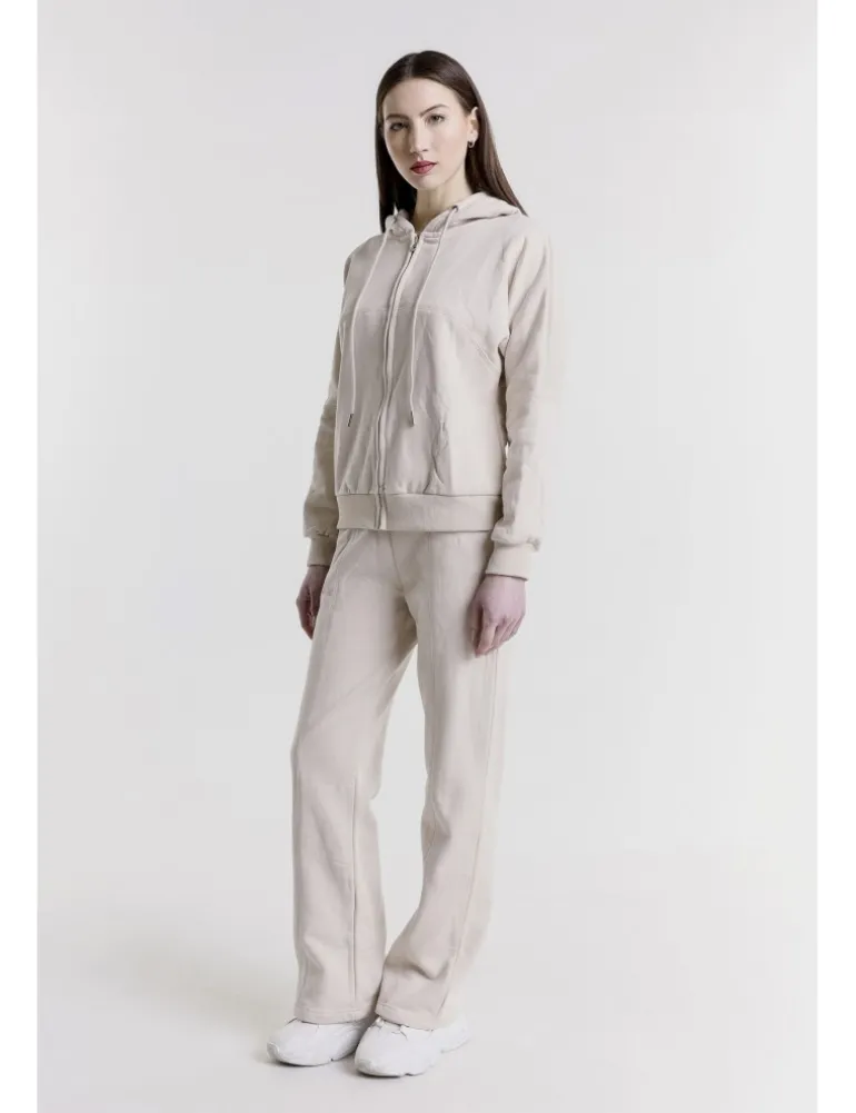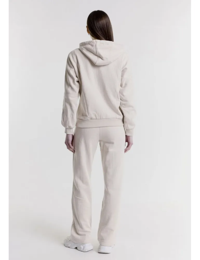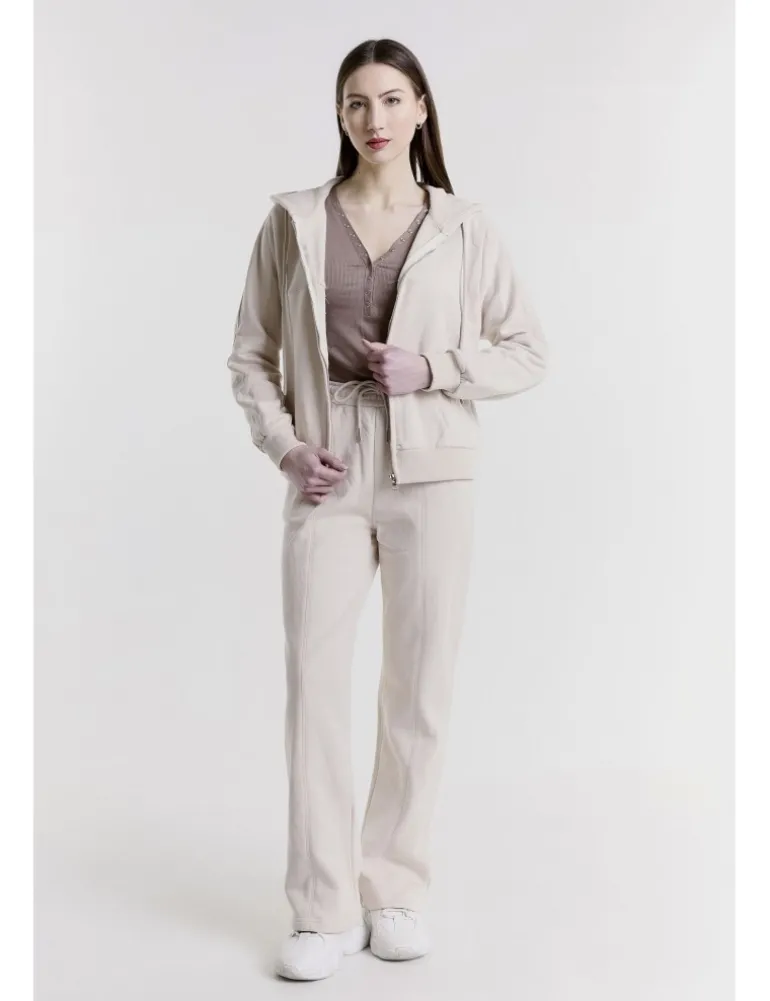 FELPA GIAVA COLORE CREMA, MORBIDO TESSUTO GARZATO, CHIUSURA CON ZIP, CAPPUCCIO CON RICAMO IN TONO, MANICA KIMONO, TAGLIO CON RIBATTITURA SUL TORACE, COSTINA SU POLSI E FONDO.