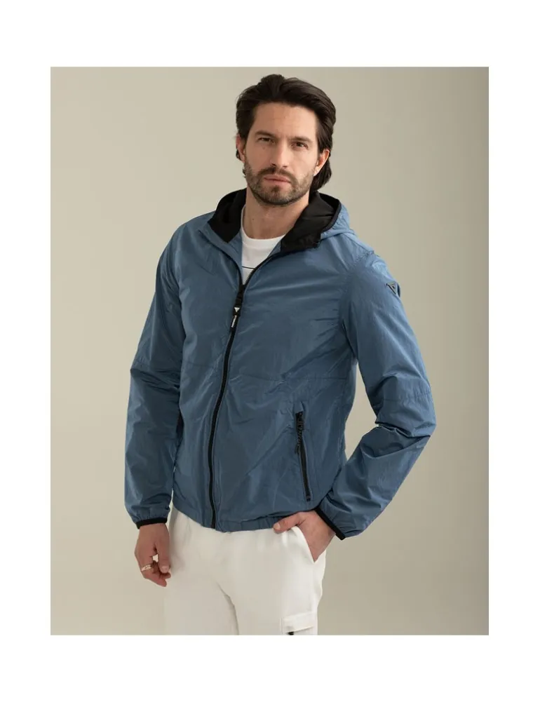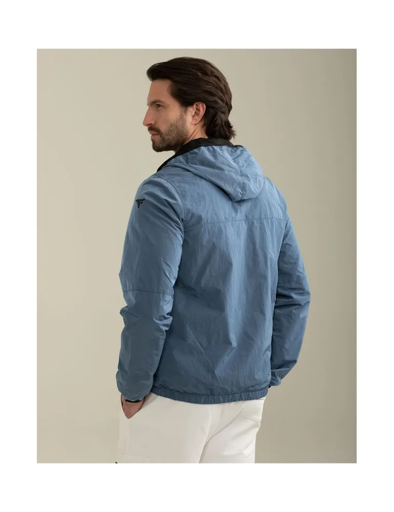 Giacca a vento color light blue con cappuccio, un capo essenziale per affrontare vento e pioggia con stile, grazie alla sua struttura leggera e resistente. Logo Fred Mello in metallo sulla manica, zip centrale e sulle tasche con tirazip logati, bordatura elastica al fondo e ai polsi con logo impresso. Fodera interna in mesh e tasca interna a petto.