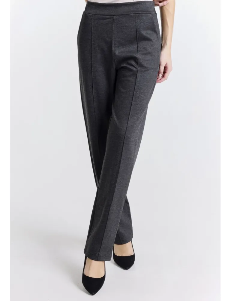 Pantalone modello kabi color grafite in punto Milano. Gamba dritta con dettaglio con tasche sagomate sul fianco, cintura posteriore elastica per una maggiore vestibilità e nervatura nel centro gamba.