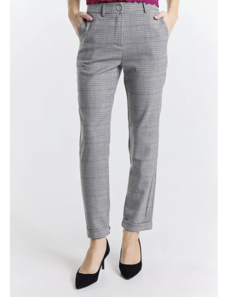 Pantalone modello rags colore grigio con motivo principe di Galles. Dettaglio con tasche sagomate sul fianco, tasche a filetto posteriori, fondo gamba con risvolto e chiusura con zip e bottone.
