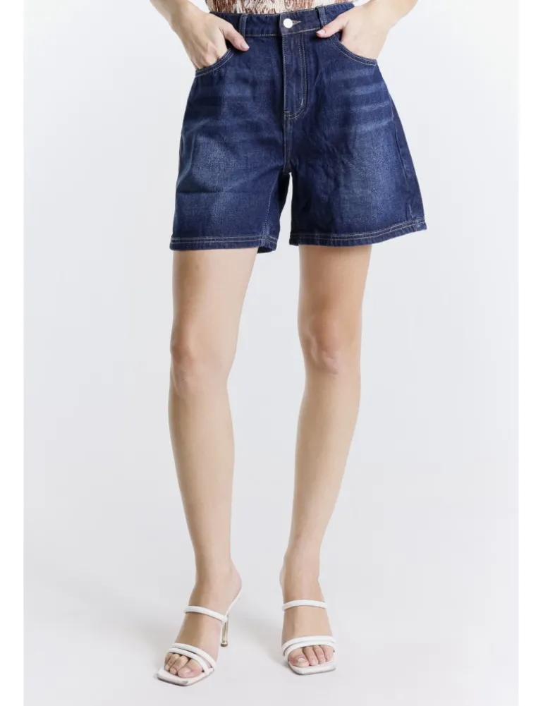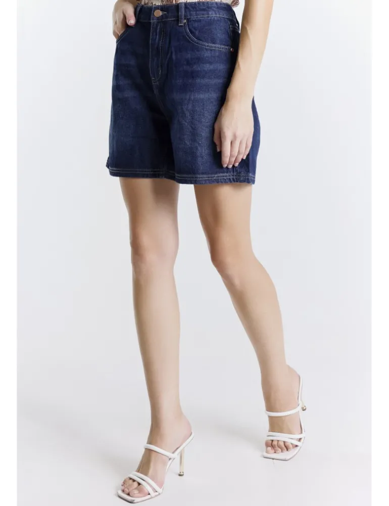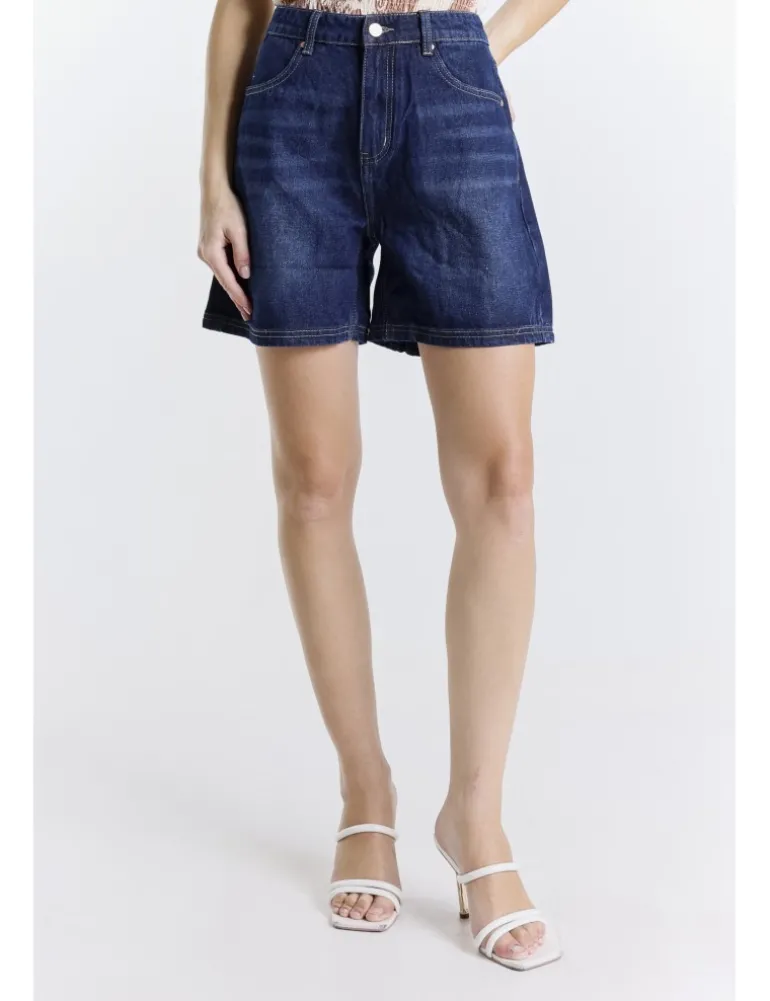 Shorts kiley in twill denim 100% cotone, lavaggio dark used. Dettagli con cuciture tabacco, gamba larga e ricamo su tasche posteriori.