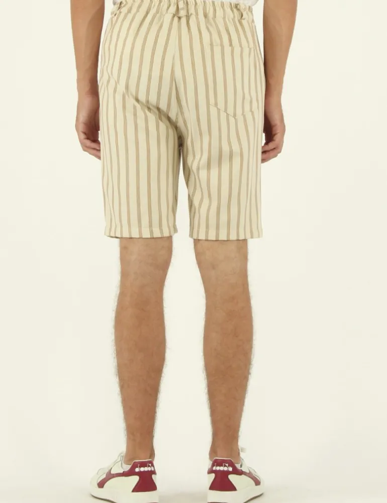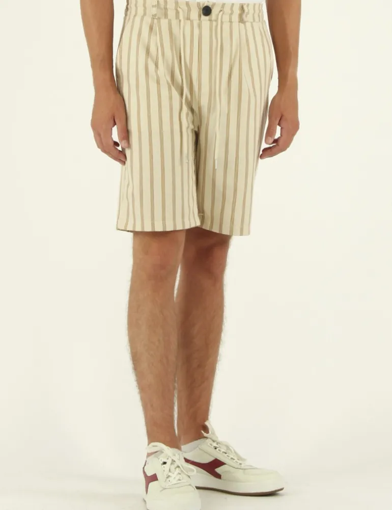 SHORT MODELLO POTTEN IN TELA DI COTONE /LINO COLORE ECRU’ , MOTIVO RIGATO COLOR CAMMELLO , TASCHE SAGOMATE , COULISSE IN VITA IN CONTRASTO