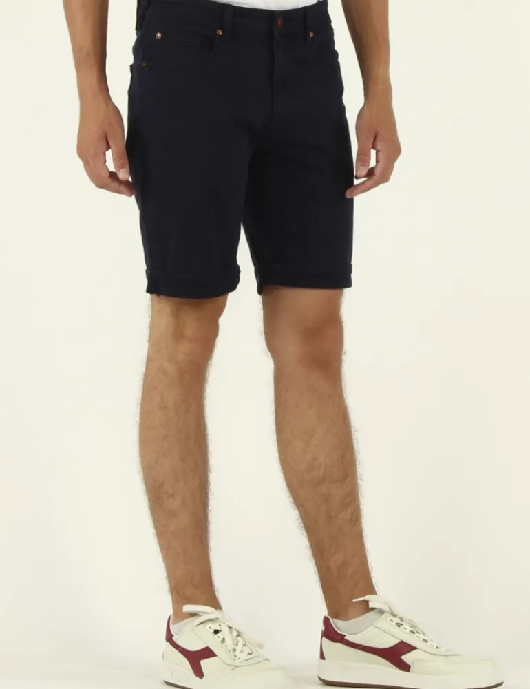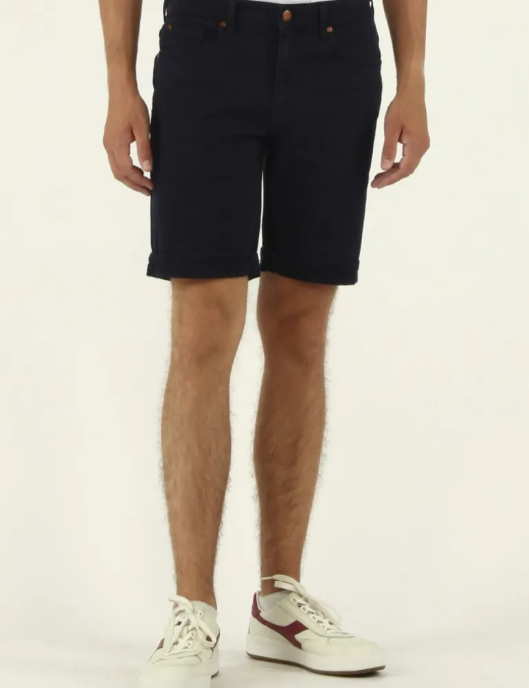SHORT MODELLO RAY IN BULL DI COTONE STRETCH COLORE BLU, 5 TASCHE CON TASCHINO PORTA MONETE ,CHIUSURA CON BOTTONE E PATTA CON ZIP,DETTAGLI IN CONTRASTO TIPICI DEL BRAND ORIGINS&CO.