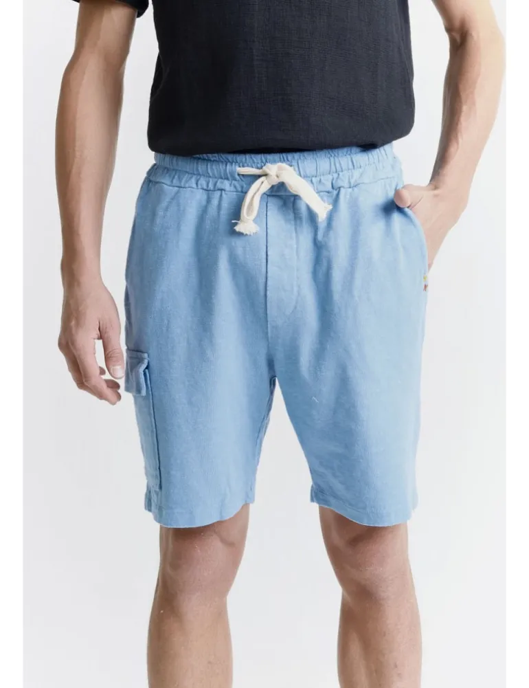 Shorts modello veron in morbido cotone, colore avio. Dettaglio taschini sui fianchi e cucitura finta patta.