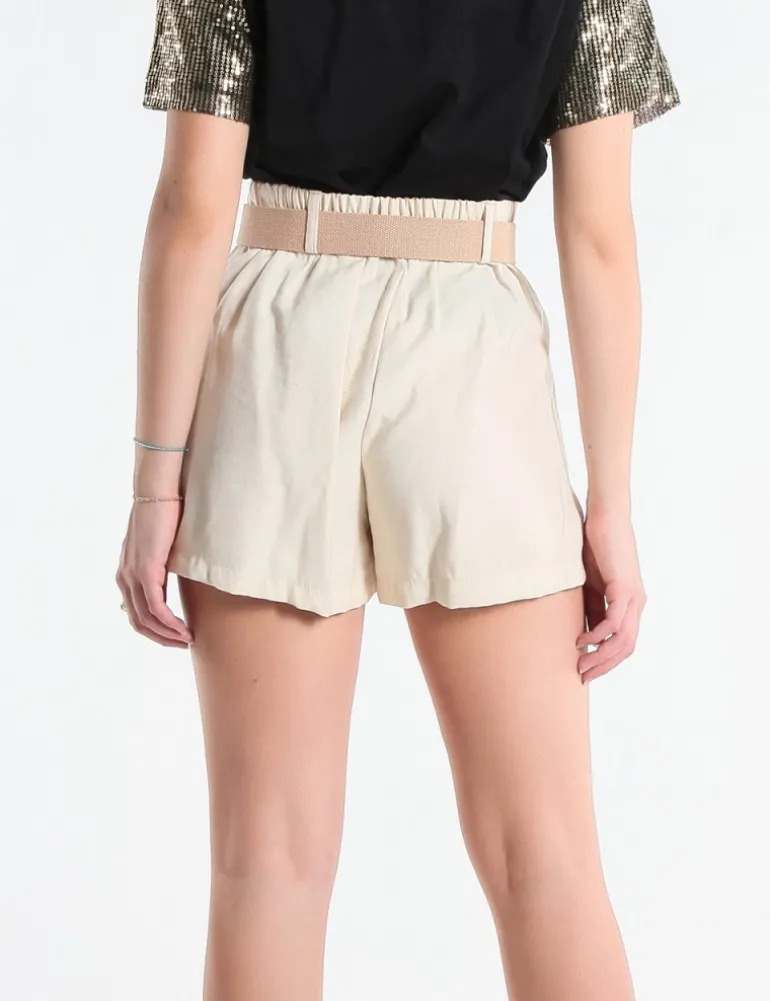 SHORT VINAN COLOR CREMA, TASCHE SAGOMATE SUI FIANCHI, PIEGHE FRONTALI, CINTURINO CON ELASTICO SUL DIETRO, CINTURA IN CORDA.