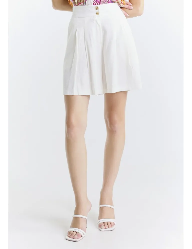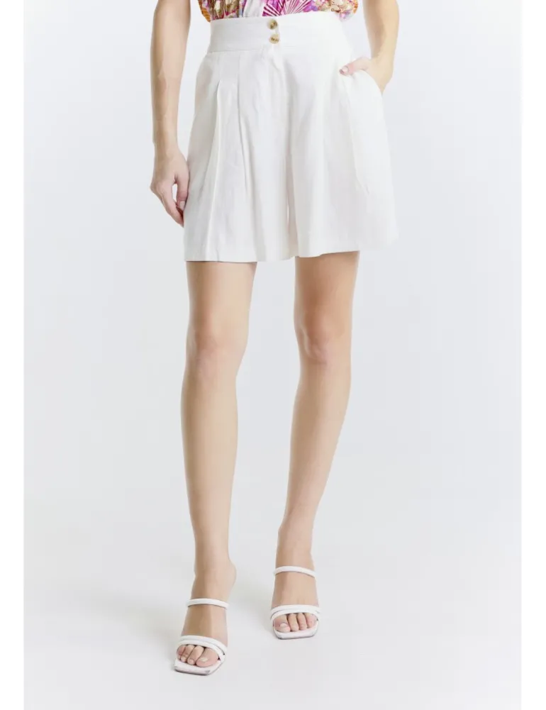 Shorts rimle bianchi con tasca sagomata sui fianchi e doppia piega frontale. Cintura alta con doppio bottone.