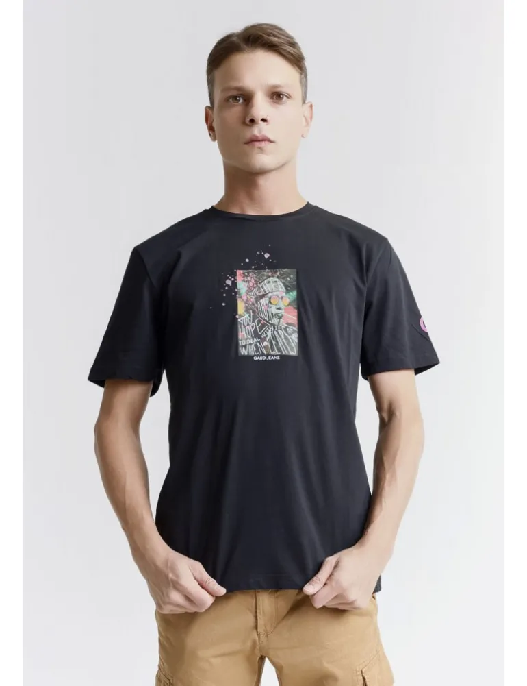 T-shirt Gaudi’ in morbido cotone, colore nero, con vestibilità regolare. Dettaglio stampa colorata sul petto e stampa logo sulla manica.