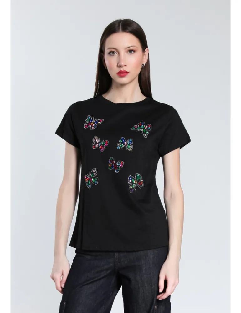 T-SHIRT IRIS VESTIBILITA’ REGOLARE CON APPLICAZIONI DI STRASS SUL DAVANTI.