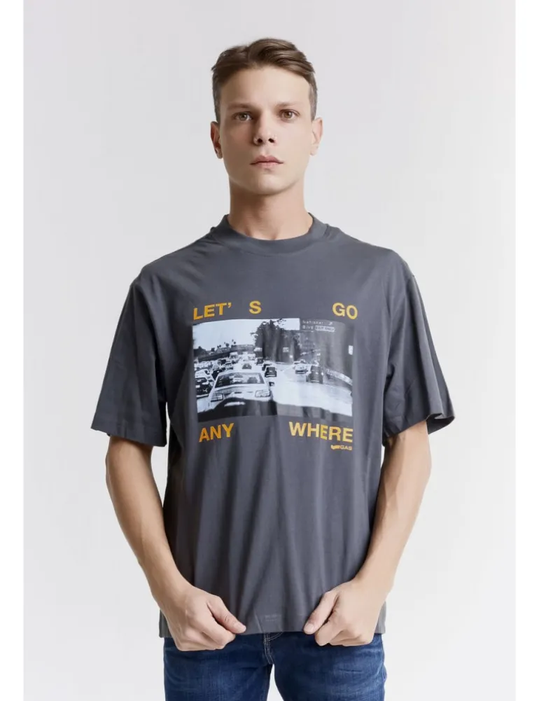 T-shirt Gas a maniche corte, modello lucin in morbido tessuto jersey di cotone, colore asfalto. Girocollo e dettaglio stampa urban sul petto.