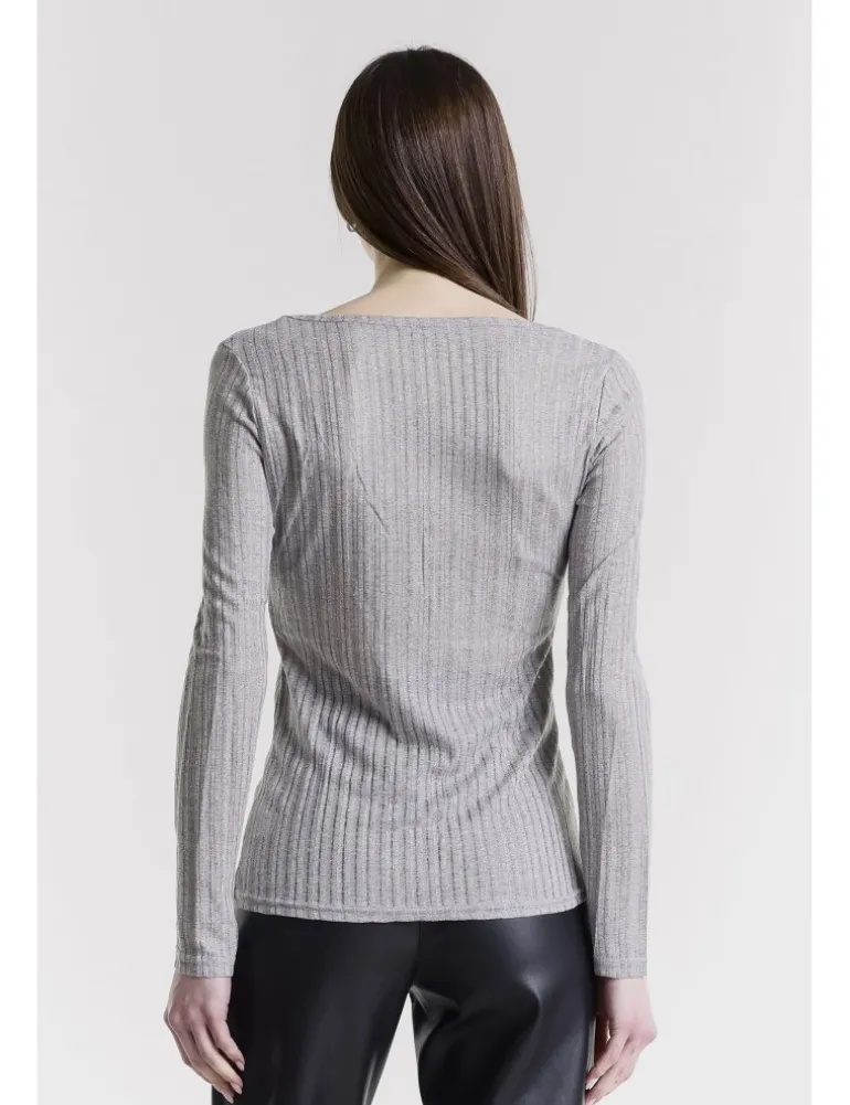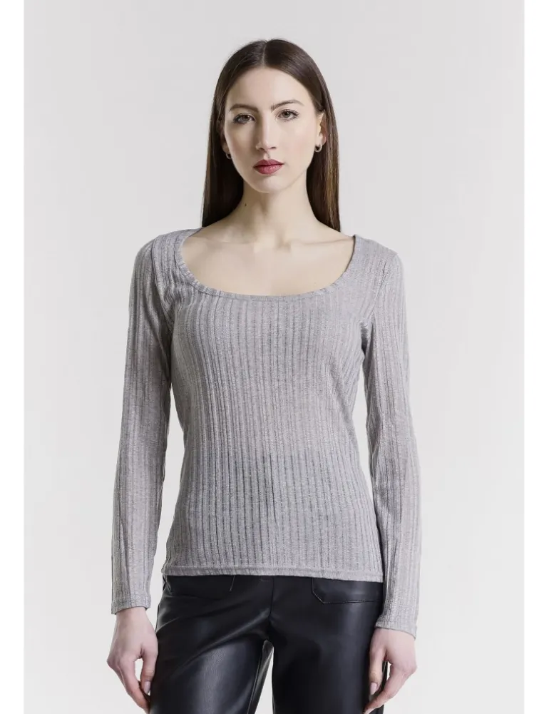 T-SHIRT SERY A MANICHE LUNGHE, COLORE GRIGIO, SCOLLO LEGGERMENTE SQUADRATO, IN TESSUTO SEMITRASPARENTE.