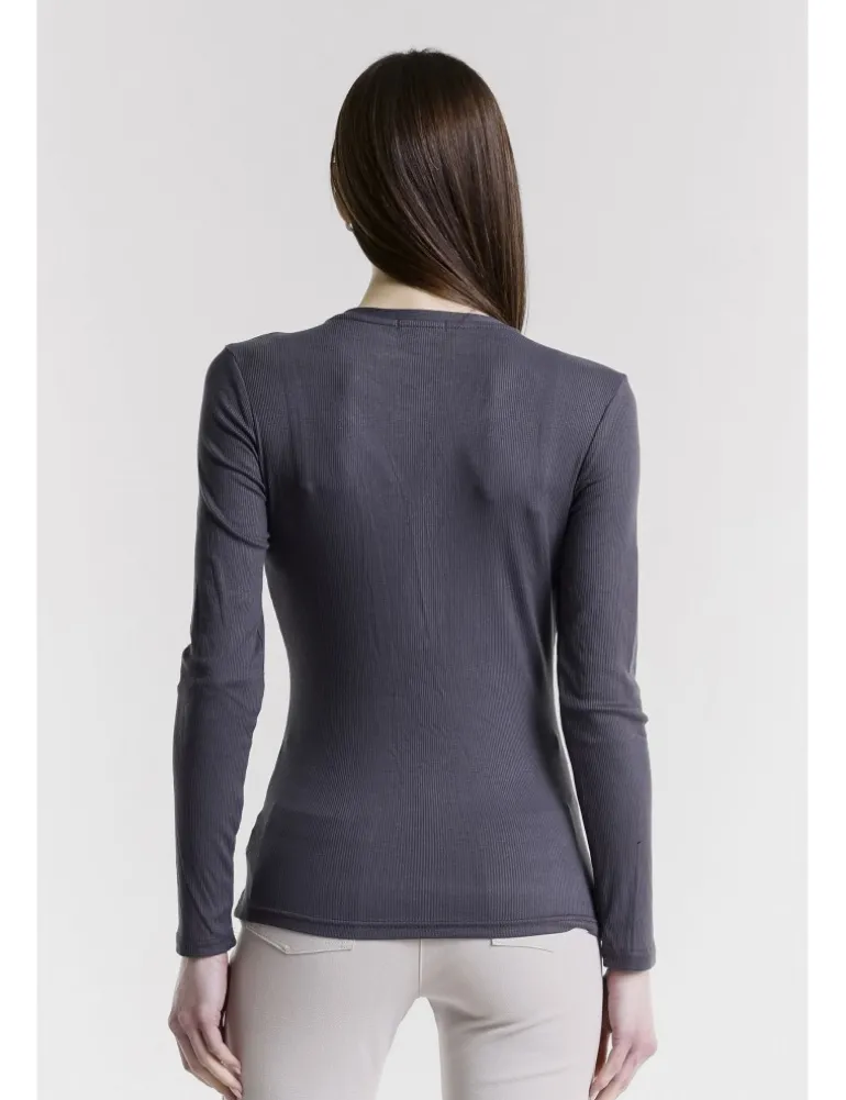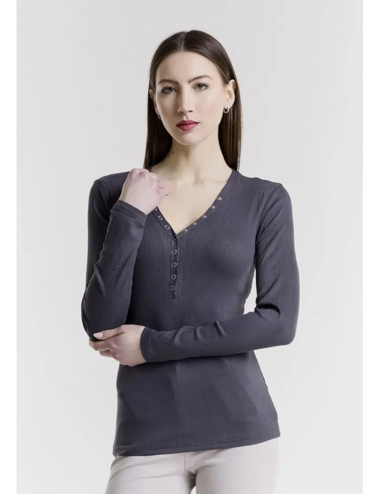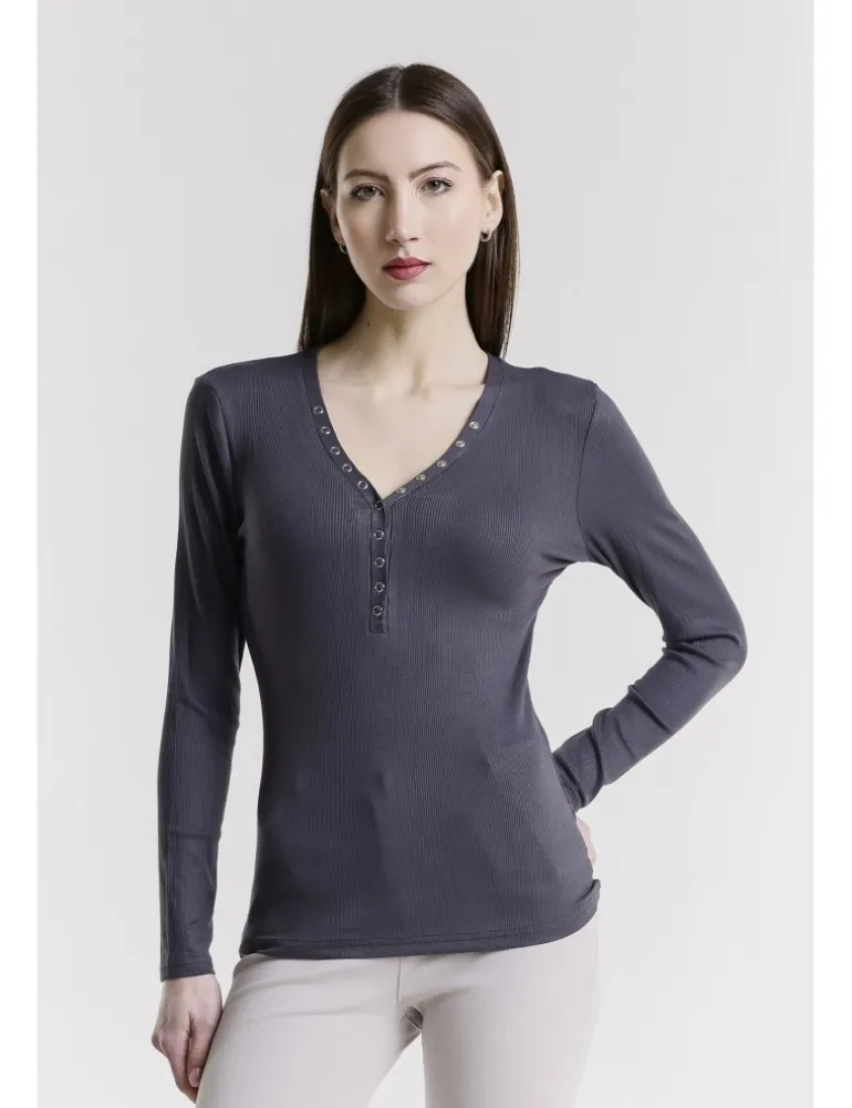 T-SHIRT PLAM COLORE PELTRO, TESSUTO A COSTINE IN VISCOSA, LINEA ADERENTE, SCOLLO A V REGOLABILE CON BOTTONCINI A PRESSIONE.