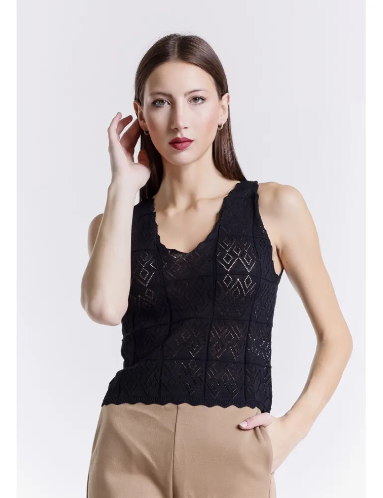 Top modello eris colore nero, vestibilità regolare con scollo a V. Lavorazione corpo con dettagli a rombi e spalline sottili.