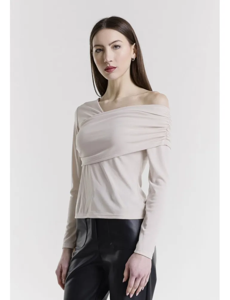TOP HIDEL COLORE GESSO, MANICHE LUNGHE, SCOLLO ASIMMETRICO CON ARRICCIATURA.